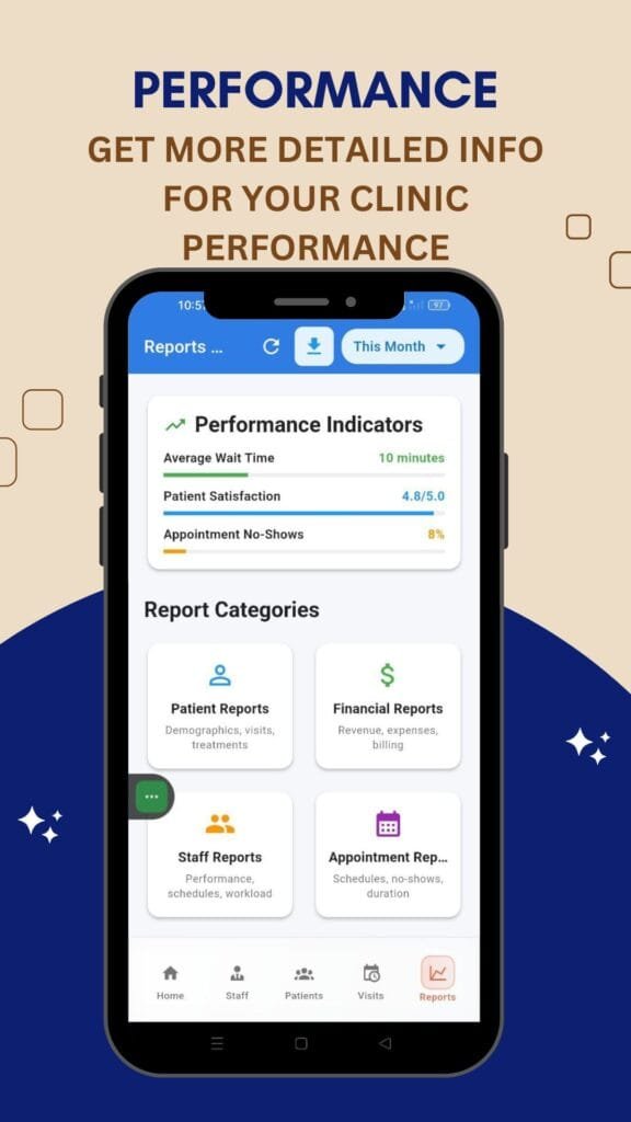 تابع أداء العيادة بشكل لحظي من خلال لوحة تقارير احترافية: